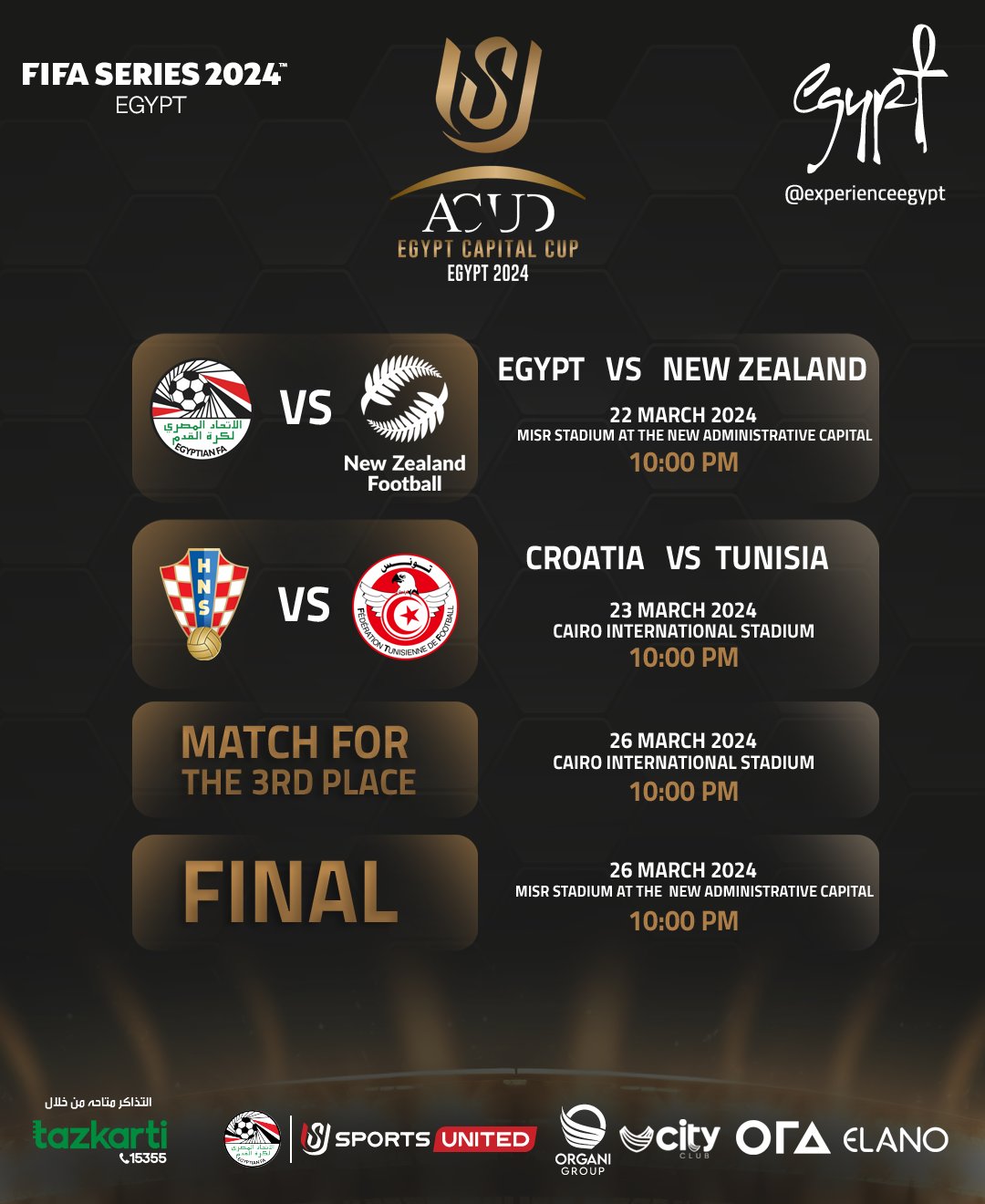 ووفقًا للمواعيد التي تم إعلانها تقام مباراة افتتاح بطولة كأس عاصمة مصر الودية في العاشرة مساء يوم الجمعة المقبل، بين منتخبي مصر ونيوزيلندا، وذلك على ملعب ستاد مصر بمدينة مصر الأولمبية بالعاصمة الإدارية الجديدة.