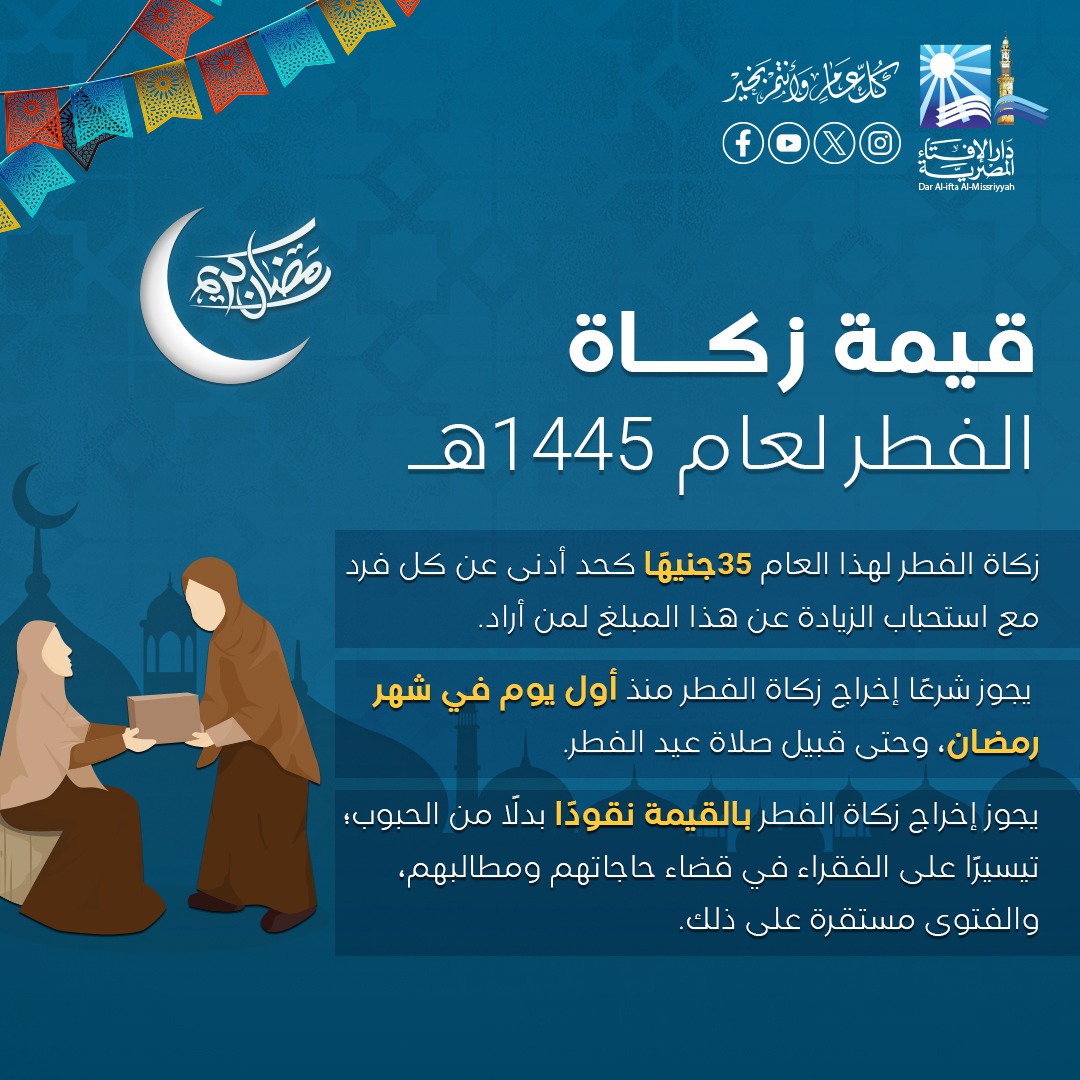 مقدار زكاة الفطر للشخص الواحد قيمتها 35 جنيها كحد أدني عن كل فرد مع استحباب الزيادة عن هذا المبلغ لمن أراد، وقيمة زكاة الفطر تعادل 2.5 كيلوغرام من القمح عن كل فرد، نظرا لأنه غالب قوت أهل مصر.