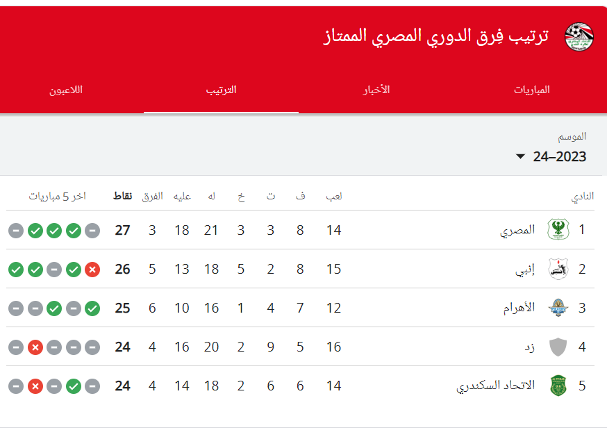 ترتيب الدوري المصري 2023_ 2024 Egyptian Premier League
