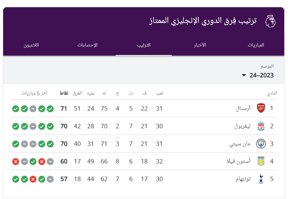 ترتيب الدوري الإنجليزي.. يريد الجميع معرفة ترتيب الدوري الإنجليزي بعد فوز أرسنال، حيث شهدت الجولة 31 من الدوري الإنجليزي الممتاز صراعًا مثيرًا على قمة الترتيب.