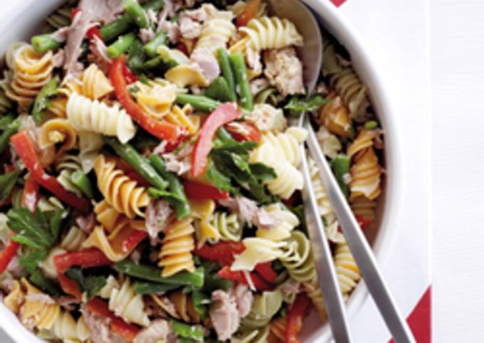 تعتمد طريقة عمل سلطة المكرونة بالتونة على استخدام التونة الطازجة بعلامة تجارية موثوقة سواء كانت تونة قطع أو تونة مفتتة كالتالي:
