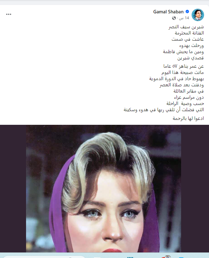 وكتب عبر حسابه بموقع فيسبوك: "شيرين سيف النصر الفنانة المعتزلة عاشت في صمت ورحلت بهدوء عن عمر يناهز ٥٧ عاما".