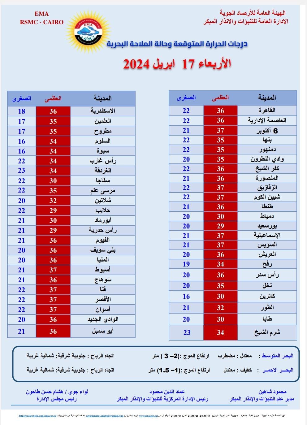 ووفقا لـ الهيئة العامة للأرصاد الجوية، تنشط الرياح المثيرة للرمال والأتربة على شمال البلاد مرورا بالقاهرة الكبرى وشمال الصعيد، ما يؤدي إلى تدهور الرؤية الأفقية على غرب البلاد، وعلى مرضى الجيوب الأنفية وحساسية الصدر ارتداء الكمامات أثناء الخروج من المنزل، ونوافيكم بـ درجات الحرارة المتوقعة اليوم الأربعاء 17-4-2024 وحالة الملاحة البحرية في هذه الصورة:
