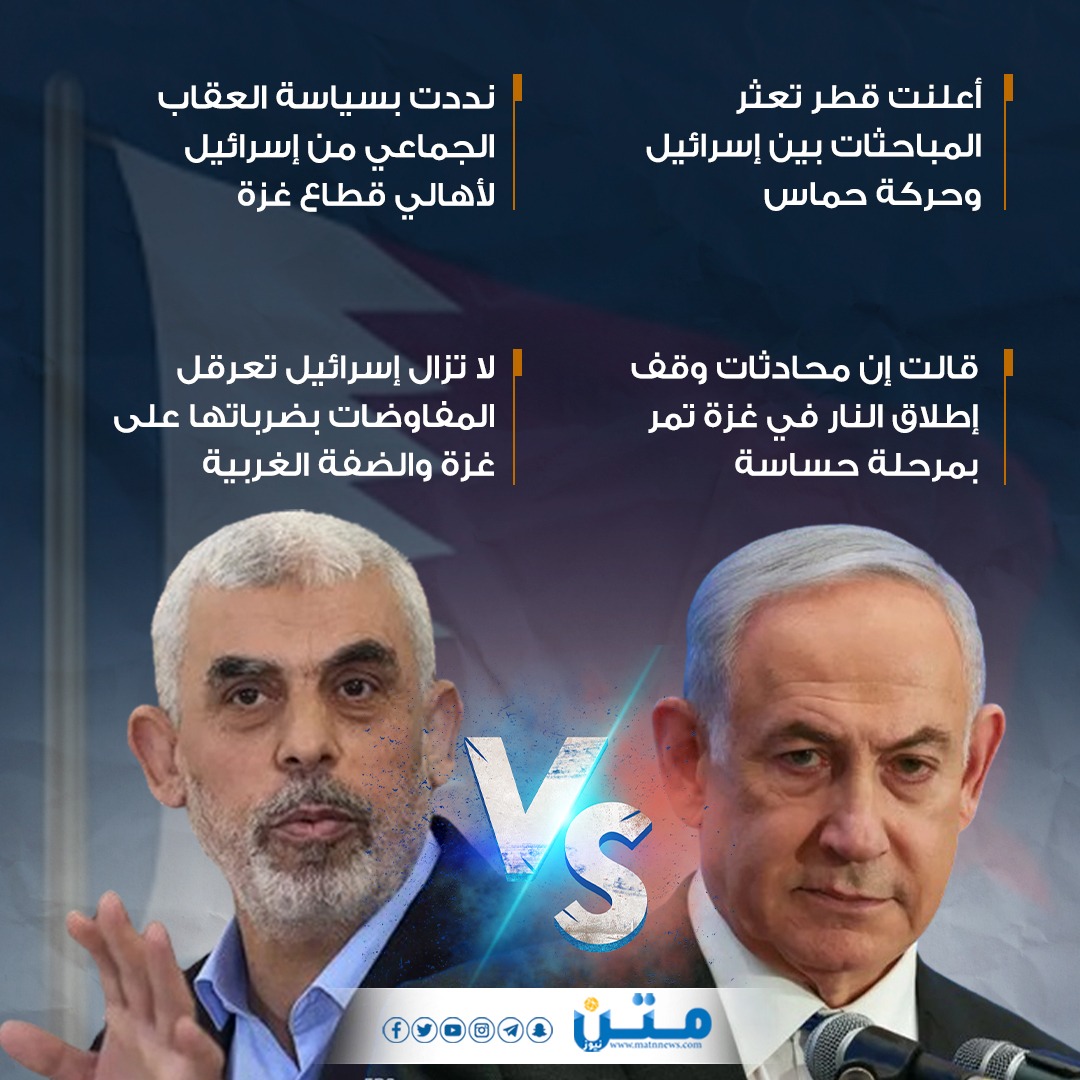 - أعلنت قطر تعثر المباحثات بين إسرائيل وحركة حماس