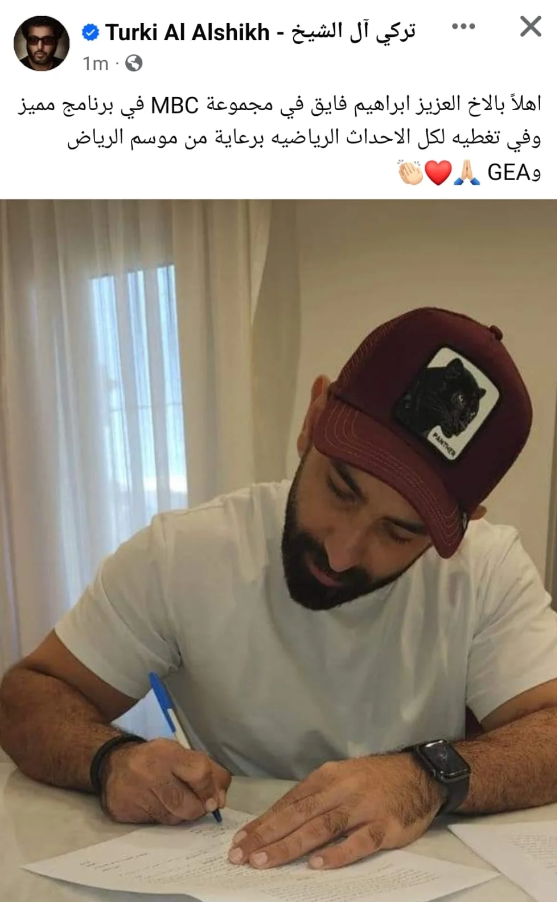 وقال تركي آل الشيخ عبر حسابه على موقع التواصل الاجتماعي فيسبوك: "أهلًا بالأخ العزيز إبراهيم فايق في مجموعة MBC في برنامج مميز وفي تغطية لكل الاحداث الرياضية برعاية من موسم الرياض وGEA".