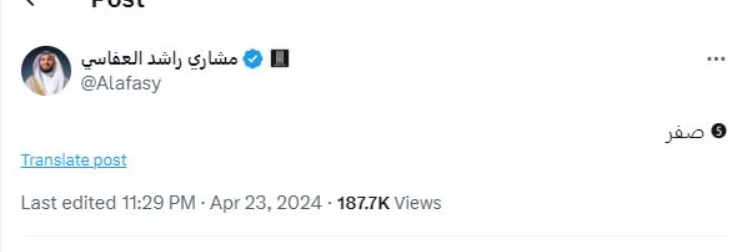 تسبب الشيخ مشاري بن راشد العفاسي في موجة غضب عارمة بين جماهير نادي الهلال السعودي، إثر التغريدة التي نشرها عبر حسابه على منصة إكس، بعد مباراة الهلال والعين في إياب نصف نهائي دوري أبطال آسيا.