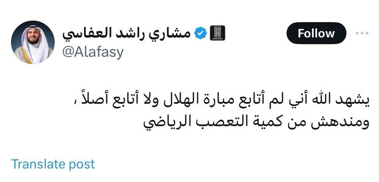 وإثر الهجوم عليه، قام العفاسي بنشر تغريدة أخرى، علق خلالها: "يشهد الله أني لم أتابع مباراة الهلال ولا أتابع أصلًا، ومندهش من كمية التعصب الرياضي".