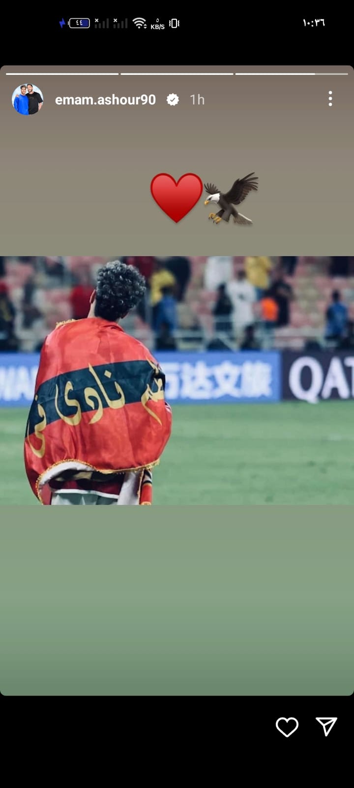 ونشر إمام عاشور عبر حسابه الرسمي على موقع التواصل إنستجرام صورة له وهو يرتدي "علم الأهلي" مع وضع شعار النسر و"قلب".