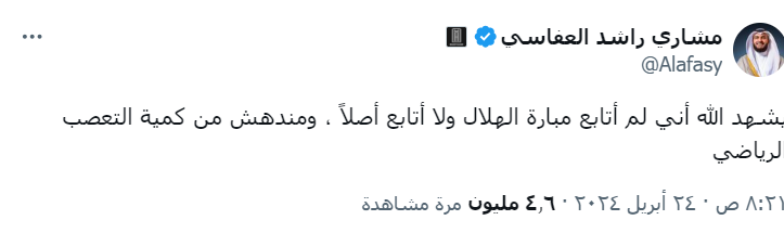 وإثر الهجوم عليه، قام العفاسي بنشر تغريدة أخرى، علق خلالها:" يشهد الله أني لم أتابع مبارة الهلال ولا أتابع أصلًا، ومندهش من كمية التعصب الرياضي".