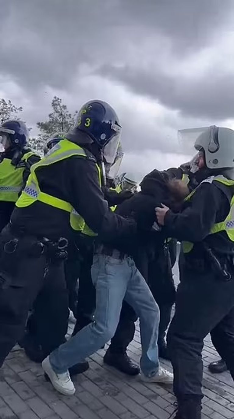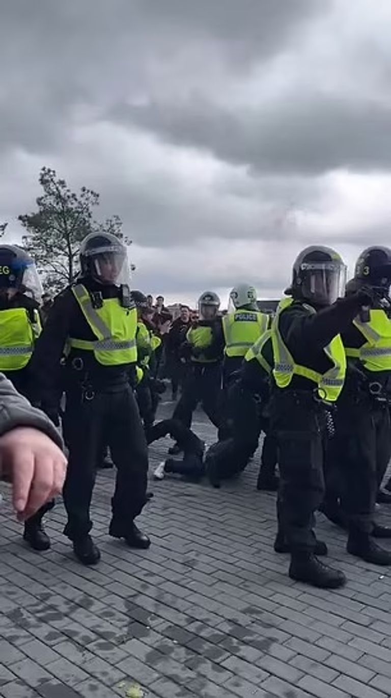 وتم دفع أحد المشجعين على الأرض بينما كان الضباط يوجهون له الضربات بشكل متكرر، بينما رد المشجعون على هذا التعامل بإلقاء المقذوفات والمشروبات على الشرطيين.