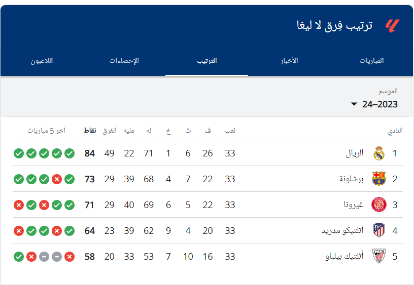 ترتيب جدول الدوري الاسباني 2023_ 2024