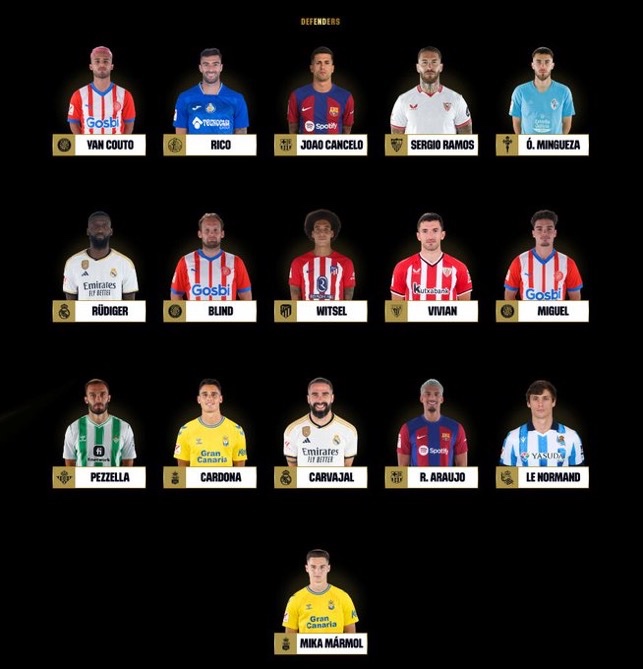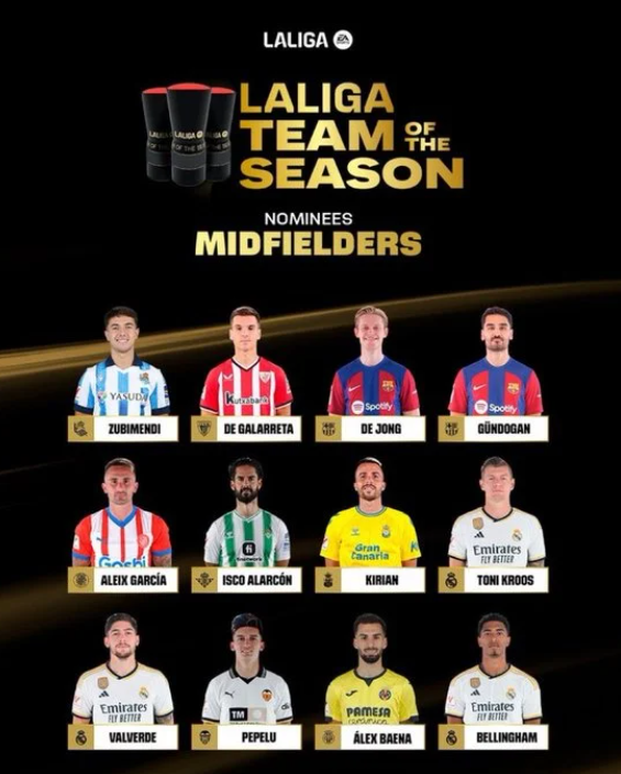 وشهدت قائمة اللاعبين المرشحين لفريق الموسم بالدوري الإسباني، سيطرة من لاعبي ريال مدريد بعد ترشيح 8 لاعبين وهم: أندرو لونين، أنطونيو روديجر، داني كارفاخال، توني كروس، جود بيلينجهام، فيدي فالفيردي، فينيسيوس جونيور، ورودريجو.