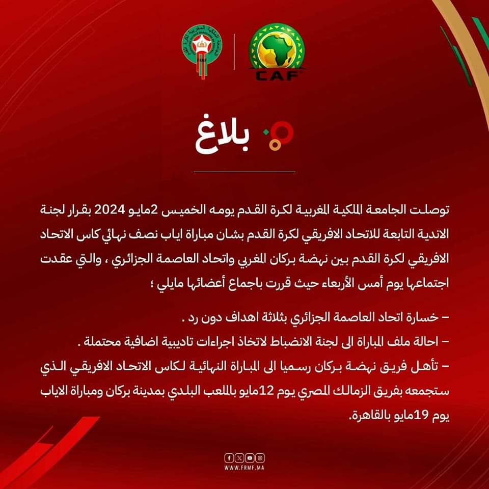 تلقى الاتحاد المغربي لكرة القدم خطابًا رسميًا من نظيره الإفريقي، بشأن قراره حول مباراة نهضة بركان واتحاد العاصمة في إياب نصف نهائي كأس الكونفدرالية الإفريقية، بعد رفض الأخير خوض اللقاء في المغرب.