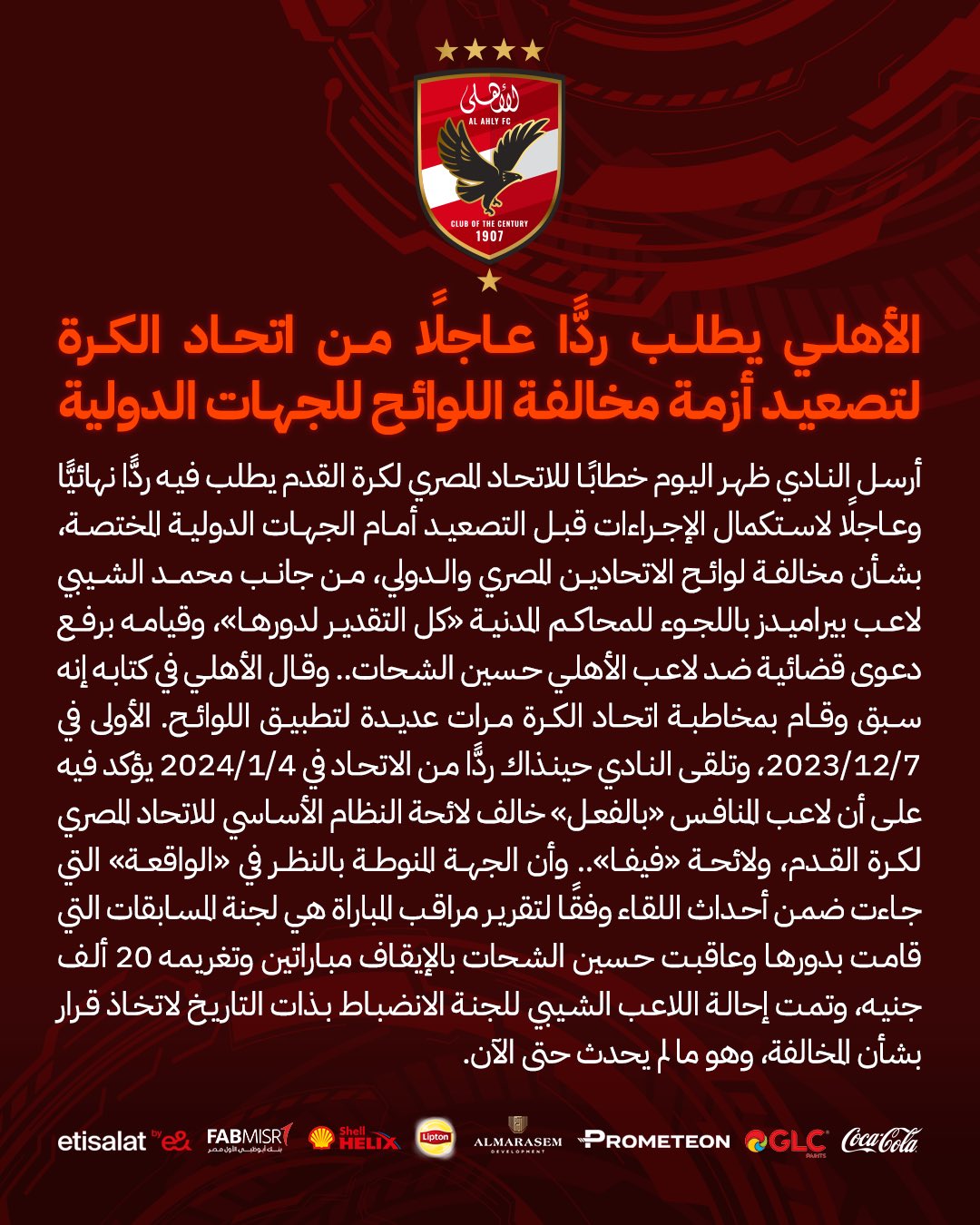 "أرسل النادي ظهر اليوم خطابًا للاتحاد المصري لكرة القدم يطلب فيه ردًّا نهائيًّا وعاجلًا لاستكمال الإجراءات قبل التصعيد أمام الجهات الدولية المختصة، بشأن مخالفة لوائح الاتحادين المصري والدولي، من جانب محمد الشيبي لاعب بيراميدز باللجوء للمحاكم المدنية «كل التقدير لدورها»، وقيامه برفع دعوى قضائية ضد لاعب الأهلي حسين الشحات.