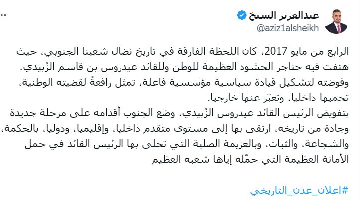 عبدالعزيز الشيخ: الرابع من مايو 2017 كان اللحظة الفارقة في تاريخ نضال شعبنا الجنوبي