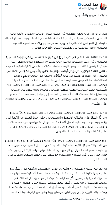 وقال الجعدي:" لقد كان اعلان عدن التاريخي في الرابع من مايو 2017م، تعبيرا عن الإرادة الشعبية الجنوبية، في ذلك والالتفاف الواسع حول مشـروع استعادة الدولة،تمخض عنه تفويض الرئيس القائد عيدروس الزبيدي بإنشاء كيان سياسي لإدارة شؤون الجنوب، على قاعدة الجنوب لكل وبكل أبناءه، وهو ما تحقق بتأسيس المجلس الانتقالي الجنوبي في الحادي عشـر من مايو 2017م، والذي مثّل تتويجا لجهدٍ تراكميًا لنضالات شعبنا الجنوبي بمساريه السلمي والكفاحي، الذي اختطهما الحراك الجنوبي السلمي والمقاومة الجنوبية. وقد شكّل المجلس الانتقالي الجنوبي منذ تأسيسه حاملا سياسيا لقضية شعب الجنوب، مختزلا ثلاثة عقود من الشتات واستطاع خلال سنوات قليلة أن ينتقل بالقضية إلى مراحل متقدمة عززت حضور الجنوب وقضيته الوطنية على مختلف المستويات وبات من الصعب تجاوزه أو الالتفاف على قضيته.