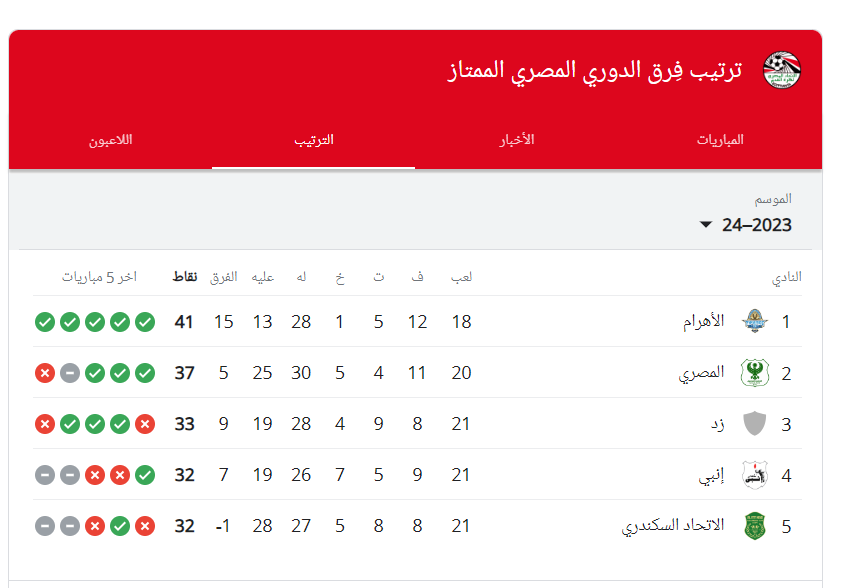 ترتيب الدوري المصري الممتاز.. ومواعيد مباريات الجولة الثانية والعشرين للمسابقة