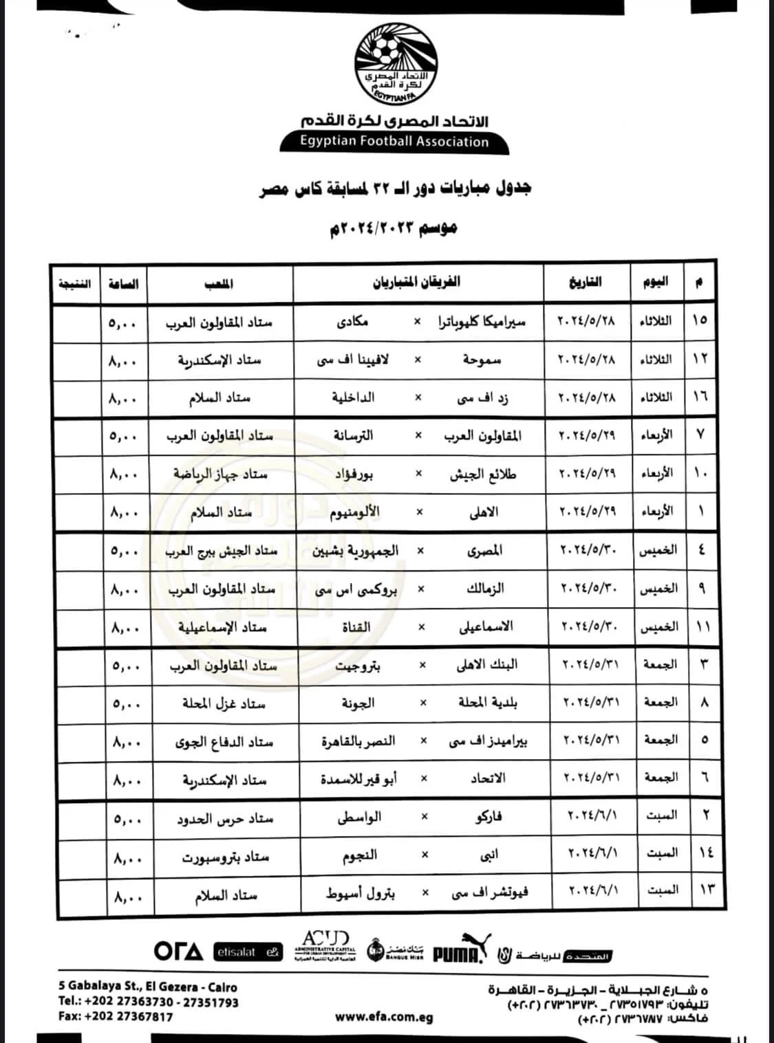 وتنطق مباريات دور الـ32 لكأس مصر يوم 28 مايو بمباريات سيراميكا ومكادي وسموحه ولافيينا وزد أمام الداخلية.