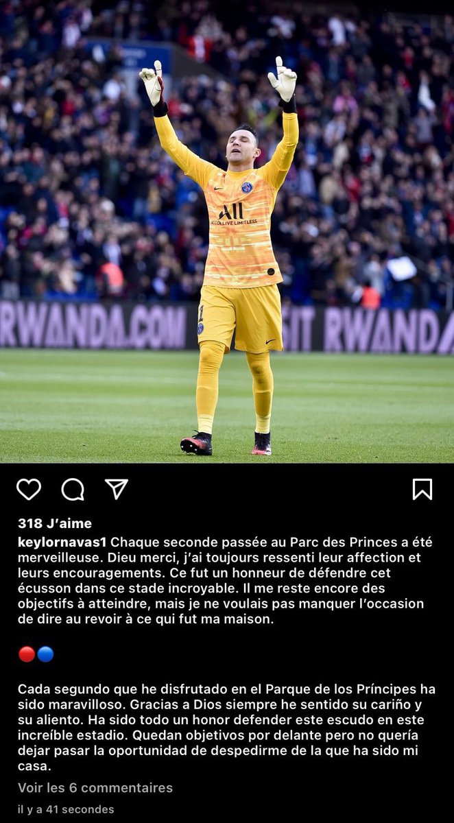وقال نافاس عبر حسابه الرسمي على موقع التواصل الاجتماعي إنستجرام: "كل ثانية أمضيتها في بارك دي برينس كانت رائعة، وأنا ممتن أنني شعرت دائمًا بمودتكم وتشجيعكم".