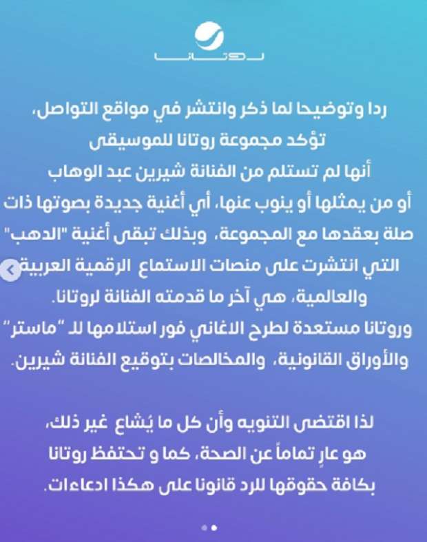 وجاء في بيان شركة روتانا: ردا وتوضيحا لما ذكر وانتشر في مواقع التواصل الاجتماعي، تؤكد مجموعة روتانا للموسيقى، أنها لم تستلم من الفنانة شيرين عبدالوهاب أو من يمثلها أو ينوب عنها أي أغنية جديدة بصوتها ذات صلة بعقدها مع المجموعة، وبذلك تبقى أغنية الذهب والتي نشرت على منصات الاستماع الرقمية العربية والعالمية، هي آخر ما قدمته الفنانة لروتانا.