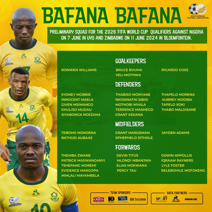 ويلعب منتخب جنوب إفريقيا ضد نيجيريا يوم 7 يونيو المقبل، وأمام زيمبابوي يوم 11 من الشهر ذاته، في تصفيات قارة إفريقيا المؤهلة لكأس العالم 2026 بالولايات المتحدة الأمريكية.