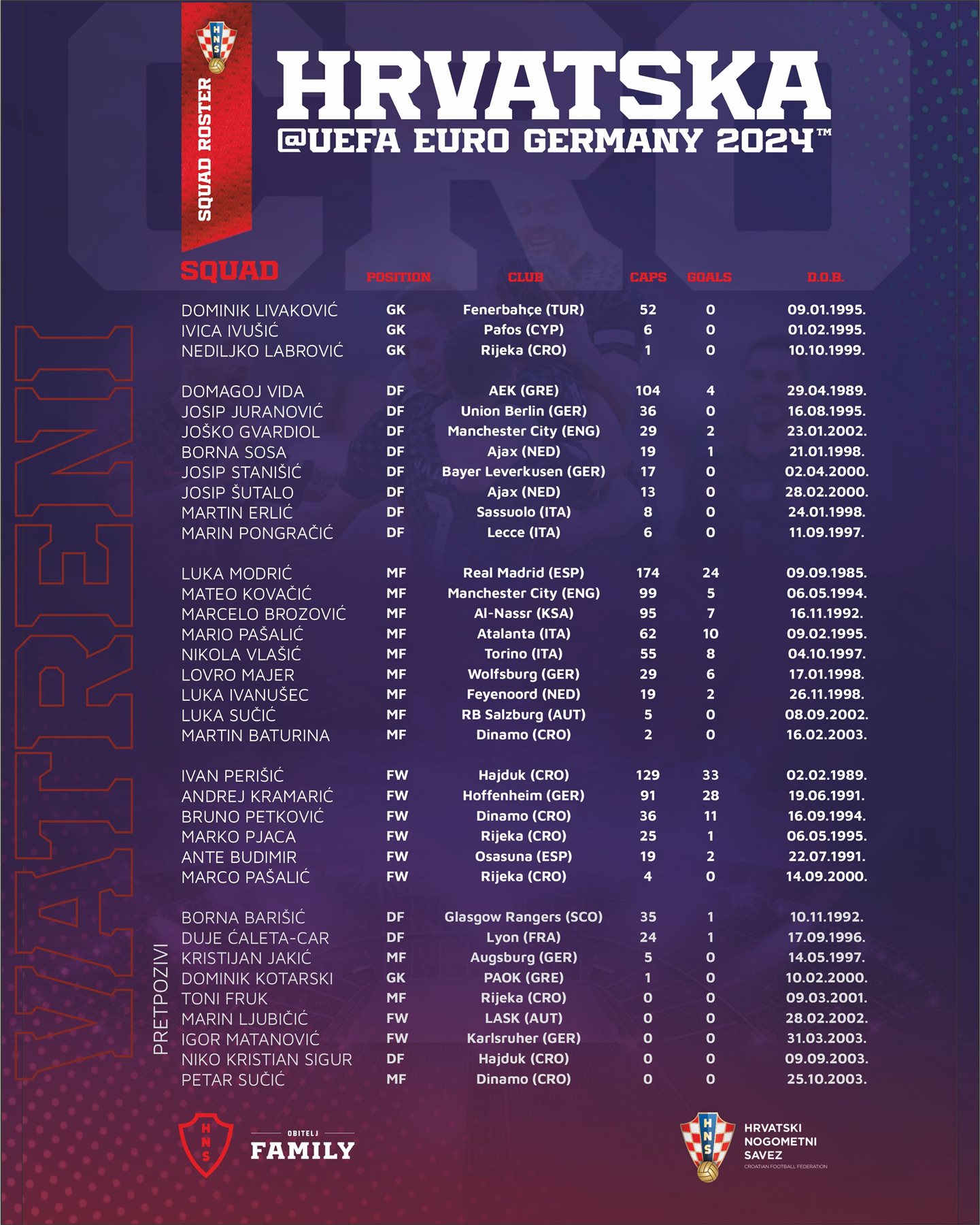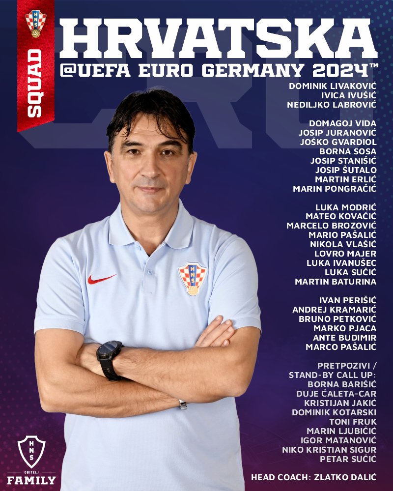 وجاءت القائمة التي أعلن الكرواتي داليتش، مدرب منتخب كرواتيا لبطولة يورو 2024، على الشكل التالي: