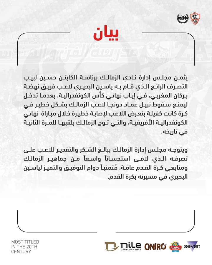 ونشر نادي الزمالك بيان رسمي جاء فيه: "يثمن مجلس إدارة نادي الزمالك برئاسة الكابتن حسين لبيب التصرف الرائع الذي قام به ياسين البحيري لاعب فريق نهضة بركان المغربي، في إياب نهائي كأس الكونفدرالية، بعدما تدخل ليمنع سقوط نبيل عماد دونجا لاعب الزمالك بشكل خطير في كرة كانت كفيلة بتعرض اللاعب لإصابة خطيرة خلال مباراة نهائي الكونفدرالية الإفريقية، والتي توج الزمالك بلقبها للمرة الثانية في تاريخه.