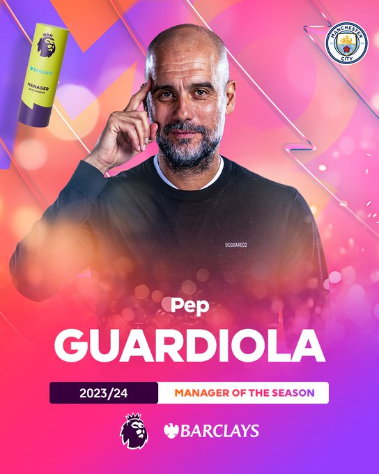 ونشر الحساب الرسمي لمسابقة الدوري الإنجليزي الممتاز، على منصة التواصل الاجتماعي "إكس"، صورة للمدرب الإسباني جوارديولا، وعلق عليها: "نقدم لكم مدرب الموسم 2023/24".