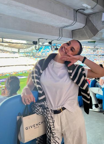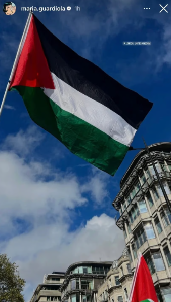 وكان الأمر الأكثر حديثًا ولفتًا للأنظار بين الجماهير، هو تواجد ماريا بيب جوارديولا في الملعب، والتي نشرت مجموعة صور لها بينما تمسك أو تظهر بجانبها حقيبتها التي تزينها بالكوفية الفلسطينية، لتأكيد مناصرتها لفلسطين.