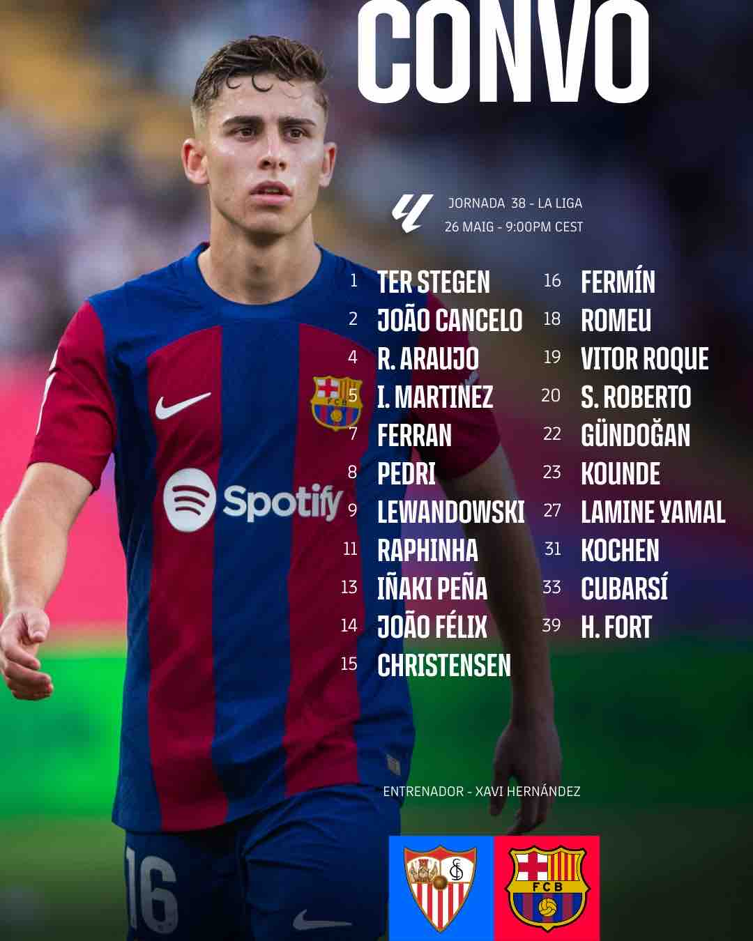 أعلن المدرب تشافي هيرنانديز، المدير الفني لفريق برشلونة، قائمة البارسا لمواجهة مضيفه إشبيلية، في المباراة الأخيرة للمدرب.