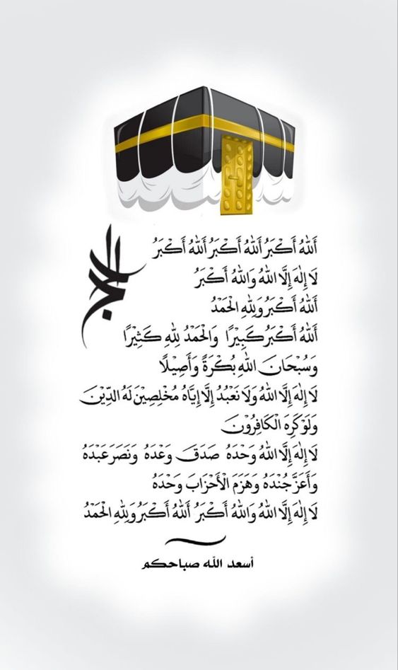 الله أكبر، الله أكبر، الله أكبر، لا إله إلا الله، الله أكبر، الله أكبر، ولله الحمد، الله أكبر كبيرًا، والحمد لله كثيرًا، وسبحان الله بكرة وأصيلا، لا إله إلا الله وحده، صدق وعده، ونصر عبده، وأعز جنده، وهزم الأحزاب وحده، لا إله إلا الله، ولا نعبد إلا إيَّاهُ، مُخْلِصِين له الدين ولو كره الكافرون، اللهم صل على سيدنا محمد، وعلى آل سيدنا محمد، وعلى أصحاب سيدنا محمد، وعلى أنصار سيدنا محمد، وعلى أزواج سيدنا محمد، وعلى ذرية سيدنا محمد وسلم تسليمًا كثيرًا.