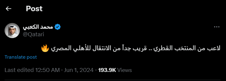 ونشر الإعلامي محمد الكعبي الذي يعمل ضمن مجموعة قنوات الكأس القطرية، عبر حسابه الرسمي على موقع التواصل الاجتماعي "إكس": "لاعب من المنتخب القطري.. قريب جدًا من الانتقال للأهلي المصري".