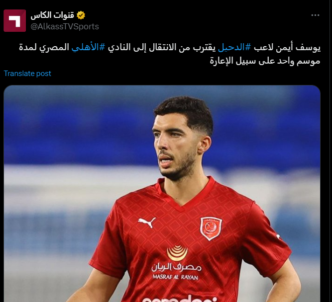 وفي وقت سابق، نشر الإعلامي محمد الكعبي الذي يعمل ضمن مجموعة قنوات الكأس القطرية، عبر حسابه الرسمي على موقع التواصل الاجتماعي "إكس": "لاعب من المنتخب القطري.. قريب جدًا من الانتقال للأهلي المصري".