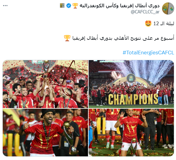 ونشر حساب الكاف، عبر حسابه الرسمي على موقع التواصل الاجتماعي "إكس"، صورا من مراسم الاحتفال للفريق الأحمر قائلا: "ليلة الـ 12.. أسبوع مر على تتويج الأهلي بدوري أبطال إفريقيا".