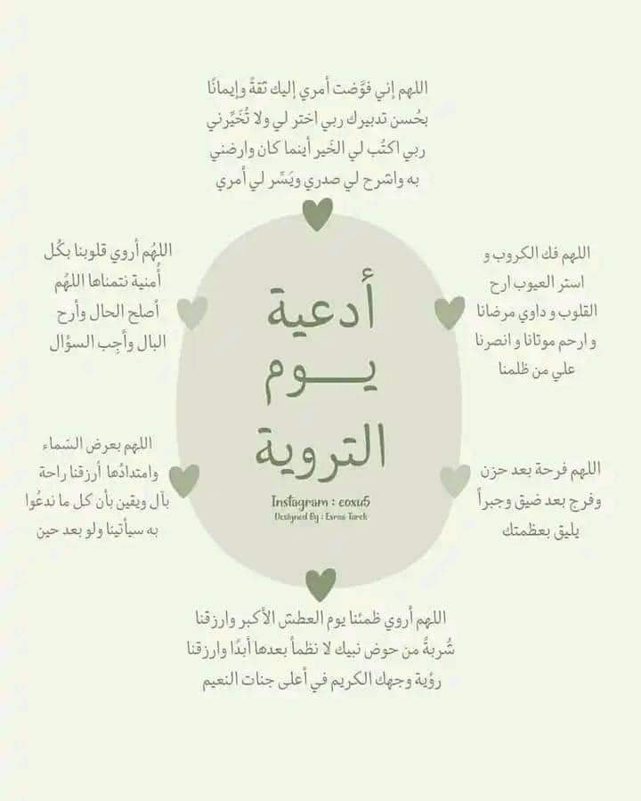 - اللهم أصبحنا لكَ حامدين شاكرين لا نعبد إلا إياك يا ربّ العرش العظيم، نسألك مع نفحات الخير القادمة من يوم التروية، أن تُبارك لنا في الطّاعات، وأن ترزقنا السّداد والتّوفيق إلى فعل الخير، واجتناب المُنكرات.