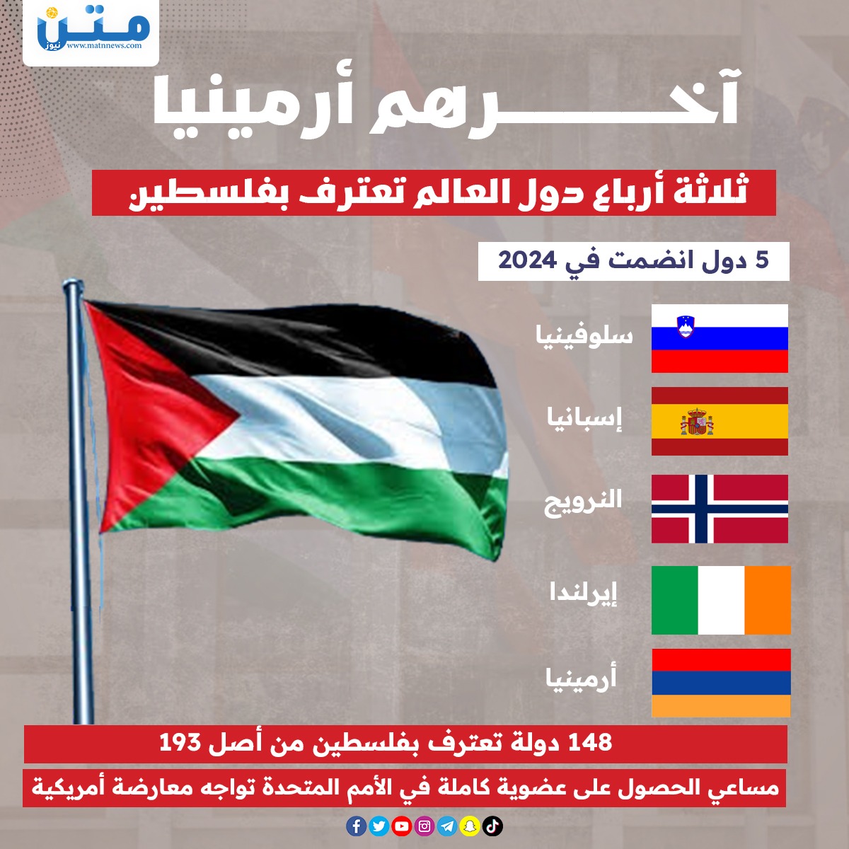 آخرهم أرمينيا.. ثلاثة أرباع دول العالم تعترف بفلسطين (انفوجراف)
