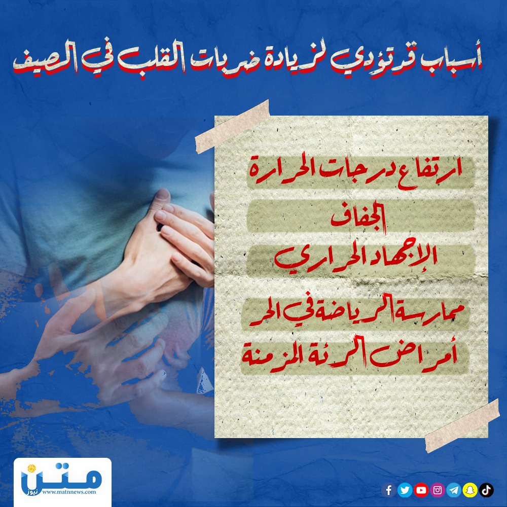 أسباب قد تؤدي لزيادة ضربات القلب في الصيف (انفوجراف) الأحد 30/يونيو/2024 - 11:25 م 6/30/2024 11:25:58 PM انفوجراف متن محمد حسن شارك طباعة -ارتفاع درجات الحرارة-الجفاف-الإجهاد الحراري-ممارسة الرياضة في الحر-أمراض الرئة المزمنة شارك الإجهاد الحراري ارتفاع درجات الحرارة ممارسة الرياضة درجات الحرارة إنفوجراف ضربات القلب