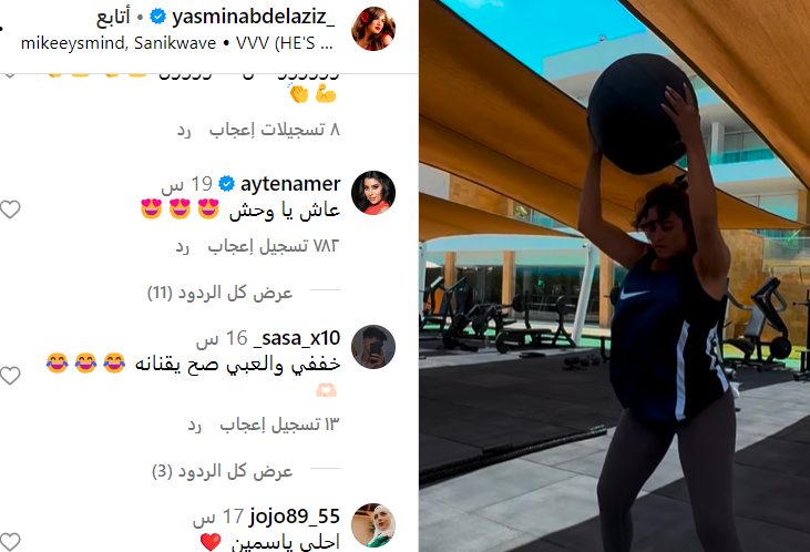 وظهرت ياسمين في الفيديو وهي تمارس عددا من التمارين الرياضية الشاقة، وتحمل الأوزان داخل إحدى صالات الجيم، ويظهر عليها خسارة الوزن واللياقة البدنية الواضحة.