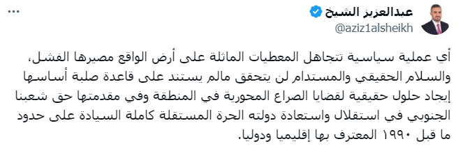وأضاف القيادي في المجلس الانتقالي الجنوبي عبدالعزيز الشيخ، أن أي عملية سياسية تتجاهل المعطيات الماثلة على أرض الواقع مصيرها الفشل.