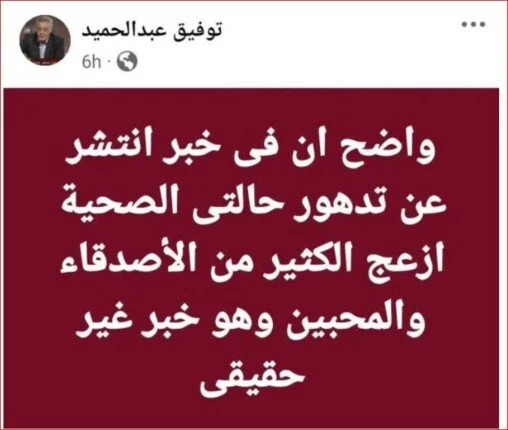 وكتب توفيق عبد الحميد، عبر صفحته الرسمية على موقع التواصل الاحتماعي فيسبوك قائلا: واضح إن في خبر انتشر عن تدهور حالتي الصحية أزعج الكثير من الأصدقاء والمحبين، وهو خبر غير حقيقي.. الحمد الله على كل حال أنا بخير وحالتي الصحية زي ما هي مفيش جديد.