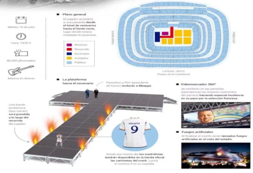 ووفقًا للخطة التي وضعها النادي لاستقبال النجم الفرنسي، فإن مبابي سيدخل إلى الملعب من ممر شرفي، على أن يكون في استقباله فلورنتينو بيريز رئيس النادي الحالي والرئيس الفخري بيري.