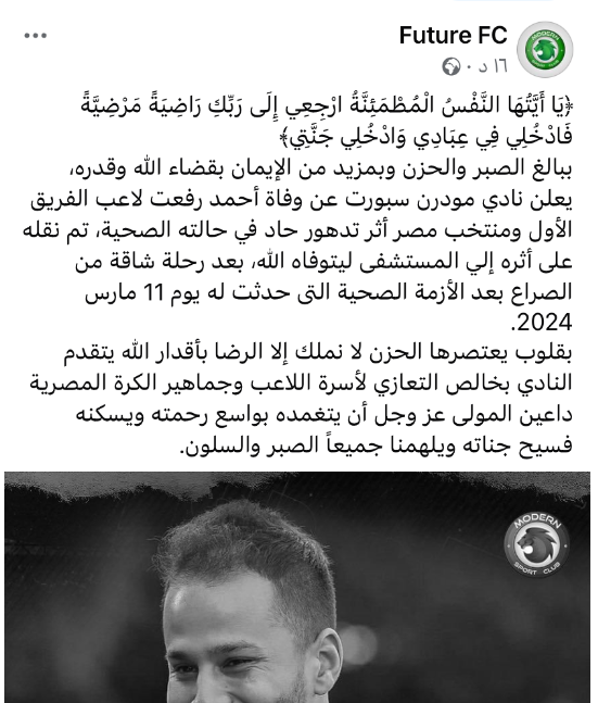 وقالت صفحة فيوتشر في منشور لها منذ قليل: يا أَيَّتُهَا النَّفْسُ الْمُطْمَئِنَّةُ ارْجِعِي إِلَى رَبِّكِ رَاضِيَةً مَرْضِيَّةً فَادْخُلِي فِي عِبَادِي وَادْخُلِي جَنَّتِي، ببالغ الصبر والحزن وبمزيد من الإيمان بقضاء الله وقدره، يعلن نادي مودرن سبورت عن وفاة أحمد رفعت لاعب الفريق الأول ومنتخب مصر أثر تدهور حاد في حالته الصحية، تم نقله على أثره إلي المستشفى ليتوفاه الله، بعد رحلة شاقة من الصراع بعد الأزمة الصحية التى حدثت له يوم 11 مارس 2024.