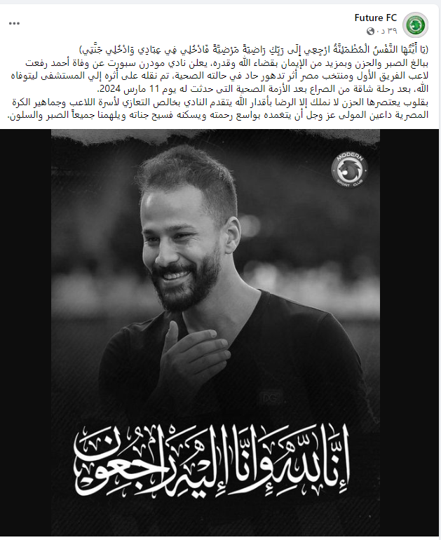 وتابع البيان: « بقلوب يعتصرها الحزن لا نملك إلا الرضا بأقدار الله يتقدم النادي بخالص التعازي لأسرة اللاعب وجماهير الكرة المصرية داعين المولى عز وجل أن يتغمده بواسع رحمته ويسكنه فسيح جناته ويلهمنا جميعًا الصبر والسلون».