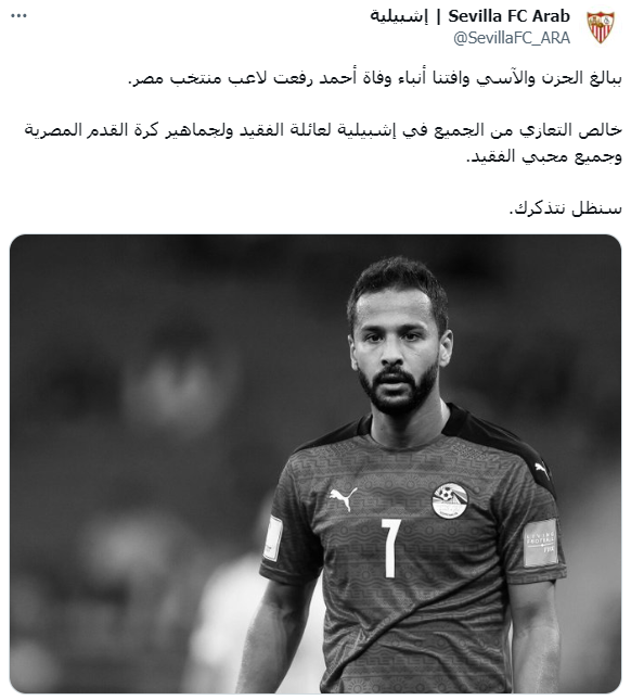 حرص نادي إشبيلية الإسباني على تقديم العزاء لجماهير الكرة المصرية وأسرة اللاعب أحمد رفعت، لاعب المنتخب المصري ونادي مودرن سبورت، الذي وافته المنية صباح اليوم، بعد صراع مع المرض.