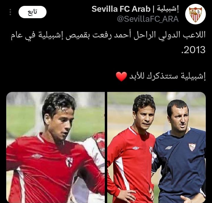 ونشر الحساب الرسمي لنادي إشبيلية الإسباني عبر منصة "إكس"، صورتين للراحل أحمد رفعت مع الفريق الأندلسي، معلقا عليها: "اللاعب الدولي الراحل أحمد رفعت بقميص إشبيلية في عام 2013".