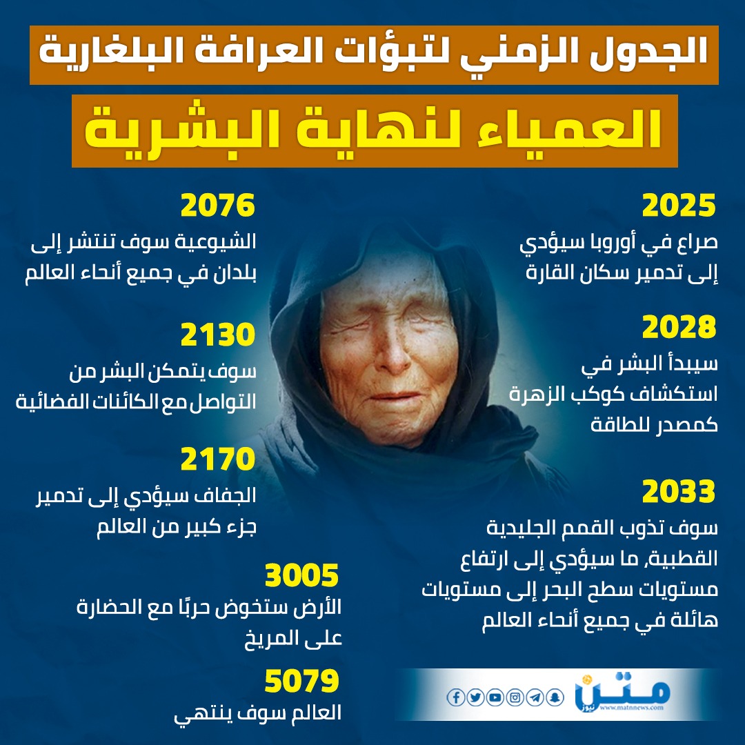 الجدول الزمني لتبؤات العرافة البلغارية العمياء لنهاية البشرية (إنفوجراف)