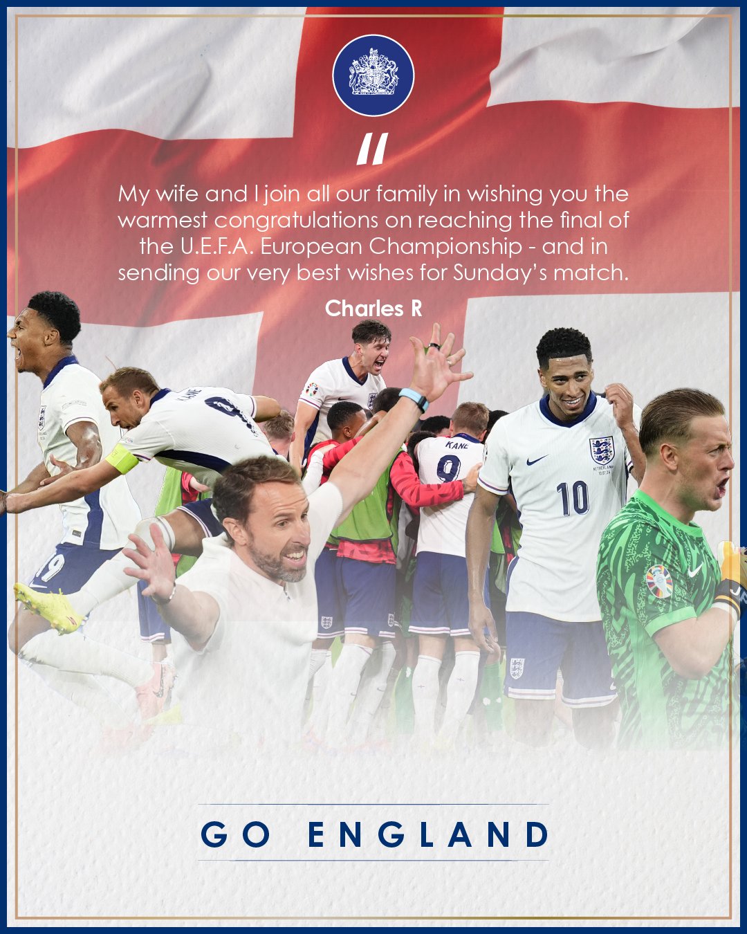 ونشر الحساب الرسمي للعائلة المالكة على منصة "إكس" رسالة من ملك بريطانيا، جاء فيها: "أود أنا وزوجتي أن ننضم إلى كل أفراد عائلتنا في تقديم أطيب التهاني لكم على التأهل إلى نهائي بطولة اليورو، وإرسال أطيب تمنياتنا لكم بالتوفيق في مباراة يوم الأحد".