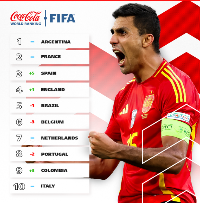وشهد تصنيف فيفا دخول منتخب كولومبيا ترتيب المنتخبات الـ10 الأوائل، حيث احتل المركز التاسع بعد حصوله على الميدالية الفضية لبطولة كوبا أمريكا 2024، واحتل منتخب إيطاليا بطل يورو 2020 المرتبة العاشرة.