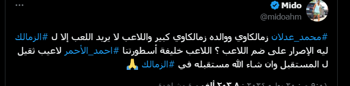 ونشر ميدو عبر حسابه الرسمي على منصة "إكس": "محمد عدلان زمالكاوي ووالده زمالكاوي كبير واللاعب لا يريد اللعب إلا للزمالك، ليه الإصرار على ضم اللاعب ؟، اللاعب خليفة أسطورتنا أحمد الأحمر، لاعب ثقيل للمستقبل وإن شاء الله مستقبله في الزمالك".