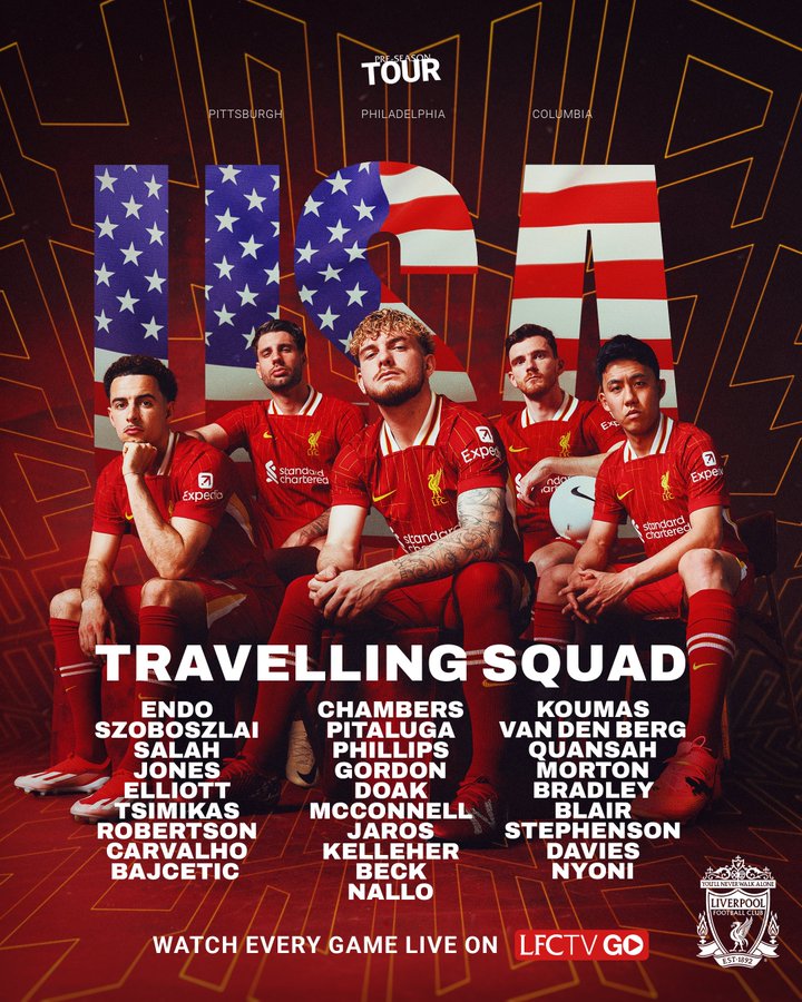 أعلن الهولندي آرني سلوت المدير الفني لفريق ليفربول الإنجليزي، قائمة الفريق المسافرة إلى الولايات المتحدة الأمريكية، لخوض فترة التحضيرات للموسم الجديد.